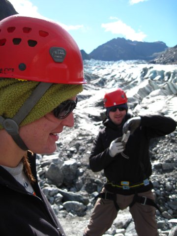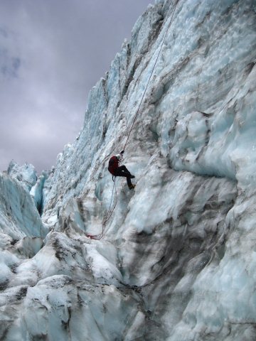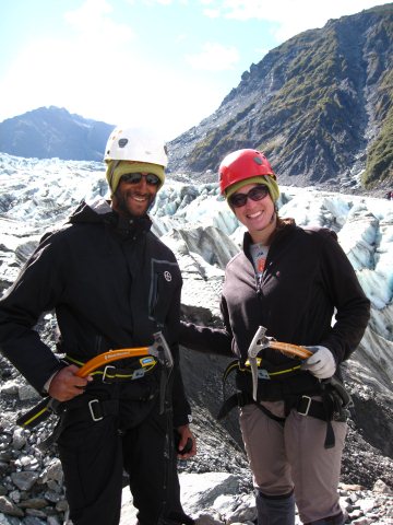 Ice climbing! We met with our Fox Glacier guide at 8am. After gathering our equipment it was a short bus ride to the glacier before we set off on foot. The hike up was probably the toughest part of the day. It was a long slog getting up to the glacier. Some parts of it were so steep that the only way up was literally one foot after another. There wasn’t any running up this thing, not even with the 12 spike crampons we had on each foot. The most dramatic parts of the glacier were at the top so that’s where we were heading. Sam, our fantastic guide and climbing instructor, had us stop a few times so he could fill us in on ice climbing techniques and show us how the equipment works. We practiced techniques like ducking, walking downhill, walking laterally across a slope, climbing a vertical ice wall with just the crampons, climbing with crampons and two ice axes, climbing with crampons and a single axe, traversing horizontally, pretty much everything there is. We were well prepared when Sam picked the first climbing spots.