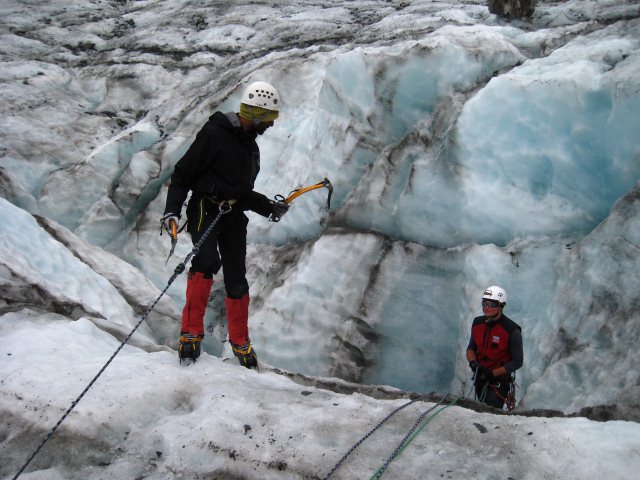 When we were done with those climbs it was around 4:30pm, we started back towards the glacier terminus so that Sam could show us (and lower us down into) a cool sounding crevasse. We’d been in a couple of small ice caves already, one before we even did any climbing but this sounded entirely different. It was about 5 when we were back and Sam had set up the safety system to lower us in. I was the first one in. Just like before, I hooked myself up to the rope and put all my weight back onto the harness. I had both feet up against the ice wall and an ice axe in each hand. Sam slowly fed me more rope as I went down deeper into the ice. I turned my gaze downward and saw how long a drop it was. Now, the last two climbs were really high up, at the top, even half way up, you felt very far from the ground. From that height a fall would likely have meant death or at the very least serious injury. Someone with a fear of heights would probably have been paralysed if they were up there and decided to look down. This though, a fall into this crevasse was certain death. It was a long, possibly 30 metre drop with sharp, jagged rocks at the bottom. It narrowed quite a lot during the descent too, claustrophobics would not have been happy. I decided to look down as I went but it didn’t help me feel better about things so I stopped doing that before long. I let Sam lower me about half way down before telling him I’d had enough. That wasn’t the end though, I still had to climb out and it would not be easy. The ice here was different to what I’d seen so far. The outer layer was very thin and brittle so I was having to kick my boots in really hard. Sore isn’t even the word for how my toes felt afterwards. I was using all my energy to keep my arms going, the axes just weren’t staying in the wall. It was a slow, painstaking process getting back out of that cave. I breathed in a deep sigh of relief when I was on (relatively) solid ground again.