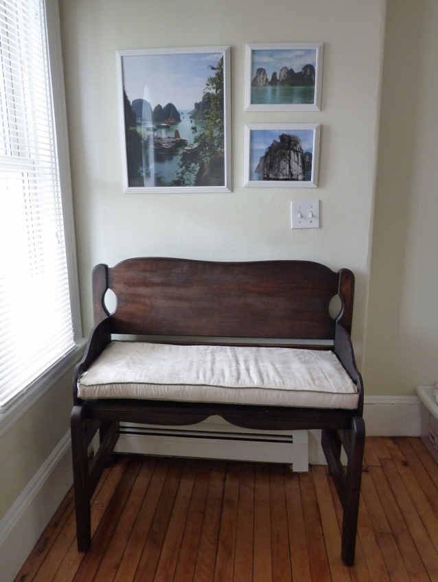 I finally made time to stop by the fabric store again, and lucked out by finding fabric that matched my pull-out couch for $2.99! Since I had all the supplies, I was able to get the cushion done on a Sunday afternoon. It was an easy box cushion, although I made it harder on myself by adding cording for a little decoration. I saw a post on Pinterest about wrapping the fabric around the cushion in one whole piece instead of cutting it, and that’s the idea I followed. I think that idea worked well for her because she didn’t use cording. I probably would have spent the same amount of time if I had cut strips, but oh well. I secured the back with Velcro instead of a zipper, because I didn’t want to struggle to put the foam into a 24” zipper hole. Plus, Velcro made the construction that much faster. Once it was finished, I wrapped the foam in batting for further cushioning and squeezed it into the new cover! Once it was on the bench I realized it is probably a little too big for the seat, but I like the way it looks, and it feels very nice to sit on!