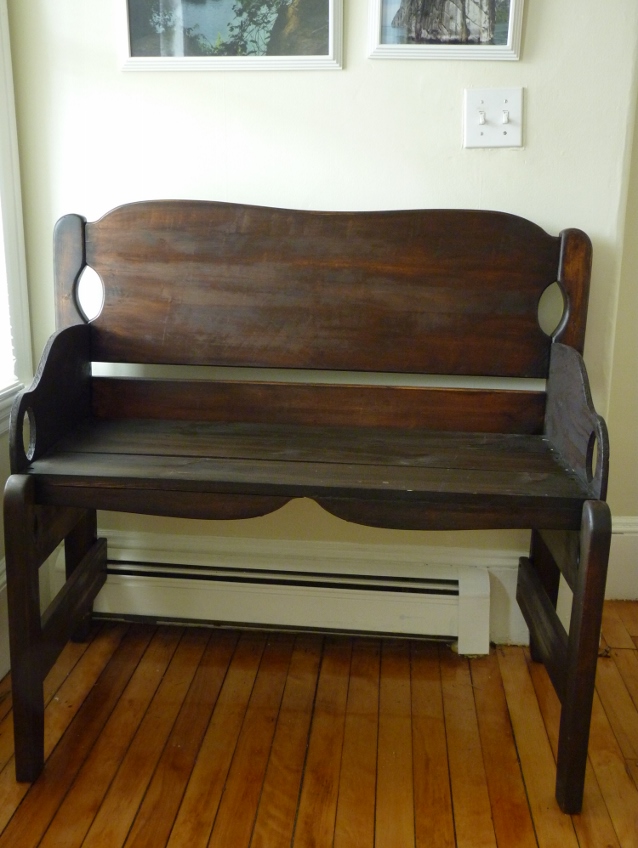 After putting the headboard and footboard together, we realized the bench looked a little silly with no arms. While it’s not the best wood, we were a bit tired of going to the Home Depot, so I drew freehand arms on a piece of particle board I already had at home. I also had the idea to use the curved bit we cut off the footboards to add a bit of decoration to the bottom of the seat. Once those were all attached, we had a bench! And sadly, it was time for my dad to go home. Which left me with the job of staining it. Needless to say, I’m a bit of a procrastinator, so I waited till the last nice weekend in October to do it outside. It was a little chilly, and slightly rained on me, but I got two coats of beautiful Kona Brown stain on the bench.